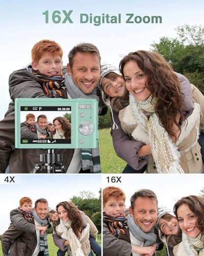 The compact digital camera, featuring FHD 1080P resolution and a 36.0-megapixel capability, enables you to capture your most thrilling and memorable moments in high-quality images and videos. Additionally, this digital camera supports a 16X digital zoom, allowing you to easily zoom in or out using the W/T button.