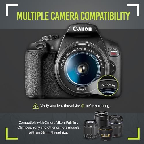 Note Prior To Ordering – Before ordering, kindly verify your camera’s lens thread size. This lens kit is compatible with all 58mm lenses. To locate your camera’s lens thread size, check the barrel or underneath your lens cap. This is preceded by a symbol for diameter “Ă˜” (example: Ă˜.58mm).