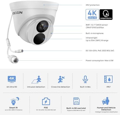 UltraHD 8MP Turret Camera — This vikylin 8mp poe camera records everything at a high resolution of 3840 x 2160,have 1/2.7″ CMOS image high-performance sensor and 2.8mm fixed lens provide an ultra-wide viewing angle of 113°, allowing you to cover more ground and keep more things important to you.