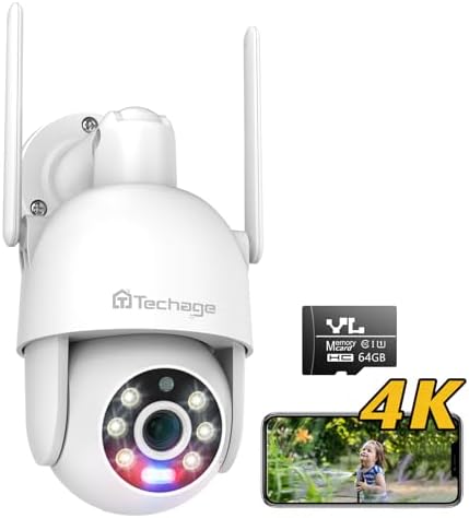 Techage Security Cameras Outdoor 8MP, 360° PTZ Cameras for Home Security Outside with 64GB SD Card, Auto Motion Tracking, 4K Color Night Vision, IP66 Weatherproof, Two-Way Audio, 2.4GHz Wi-Fi